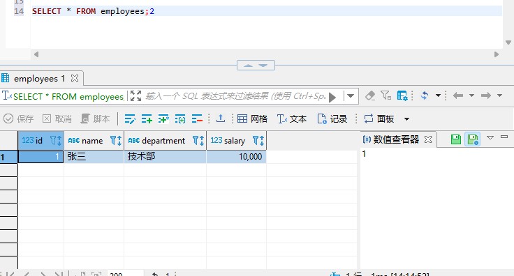 VALUES ('张三', '技术部', 10000.00);