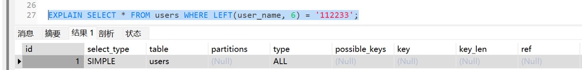 EXPLAIN SELECT * FROM users WHERE LEFT(user_name, 6) = '112233';