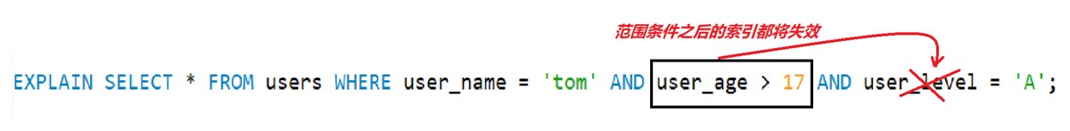 -----使用范围条件 user_age>17 ,user_level索引就失效了 EXPLAIN SELECT * FROM users WHERE user_name = 'tom' AND user_age > 17 AND user_level = 'A';