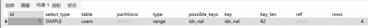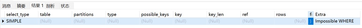 EXPLAIN SELECT * FROM users WHERE user_name IS NULL; ---Impossible where: 表示where条件不成立,不能返回任何的行