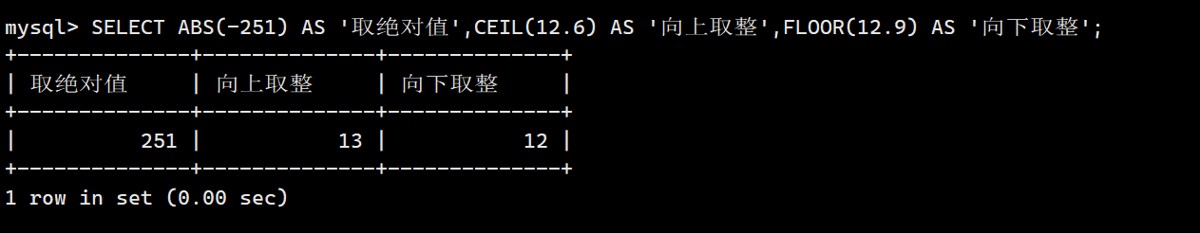 ABS(x): 取绝对值(正数),CEIL(x) / CEILING(x): 向上取整(进一法)。返回不小于x的最小整数,FLOOR(x): 向下取整(去尾法)。返回不大于x的最大整数