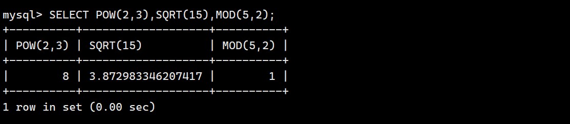 POW(x, y) / POWER(x, y):x的y次方,SQRT(x): 开平方根,MOD(n, m): 取模(求余数)