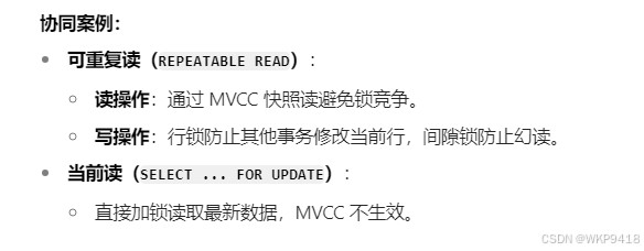 MVCC(多版本并发控制)则是通过维护数据的多个版本,让读操作无需等待写操作完成,从而提高并发性能,同时保证事务隔离性。(会将每一次修改的数据用一个链表链接好,相当于历史记录)。mysql 数据库中,每一条数据都保存一个创建时的版本号和一个删除版本号,MVCC就是根据这两个来发挥作用的。