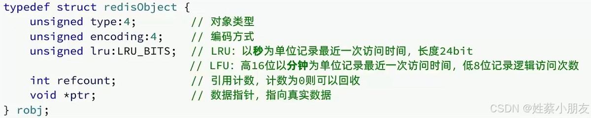 key的访问次数和访问时间都会封装在redisObject对象中:ptr指向key-value具体值
