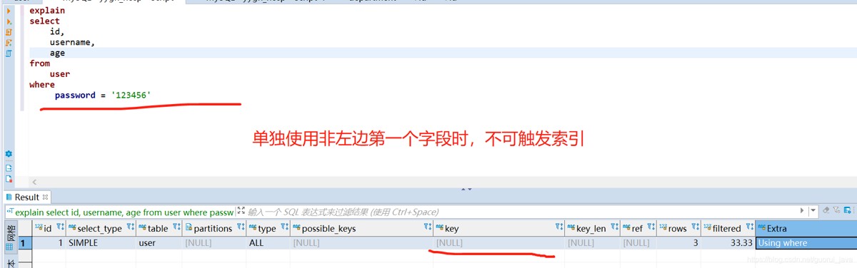 (4)单独使用联合索引的其它字段时,不可触发联合索引