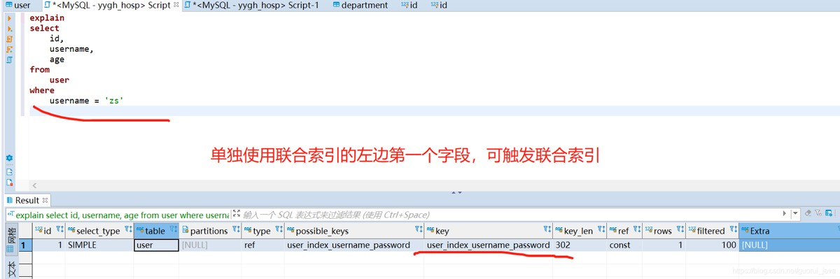 (3)单独使用联合索引的左边第一个字段时,可触发联合索引