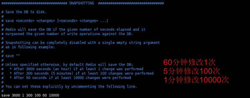 - 在redis.conf中通过save指令配置阈值。当在指定时间内发生足够数量的键修改时自动触发bgsave