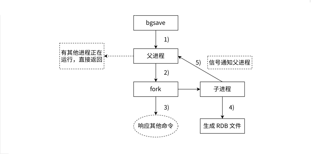 - bgsave命令:异步非阻塞式触发,Redis会fork一个子进程执行持久化操作,主进程继续处理请求