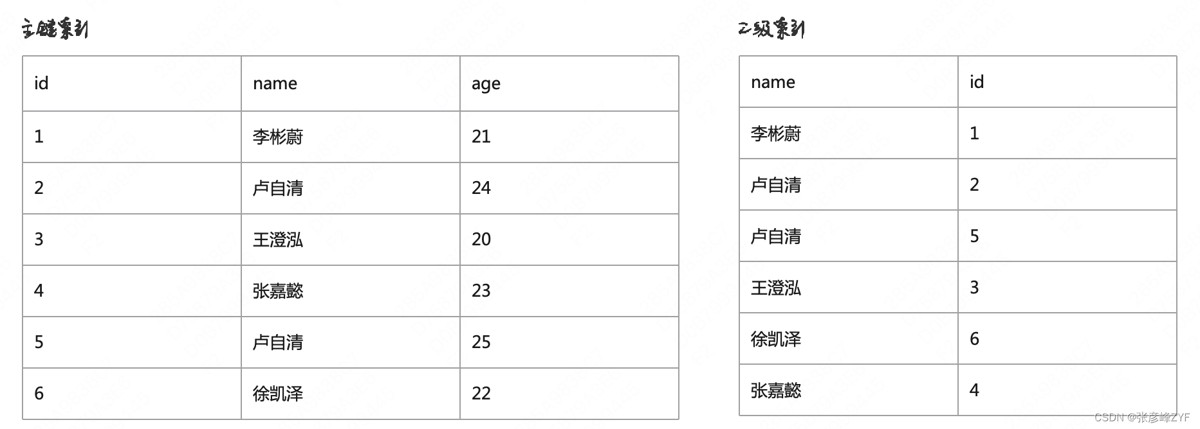 假设我们有一张表user(id, name, age),id是主键,name是普通索引。索引数据如下