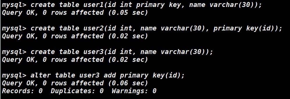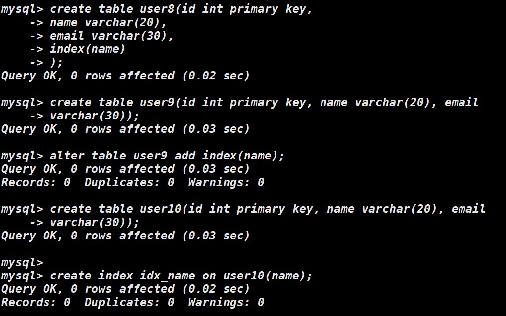 创建索引有三种方式,第一种直接跟在列后面,第二种在最后面指定列,第三种创建完表后对指定列添加索引
