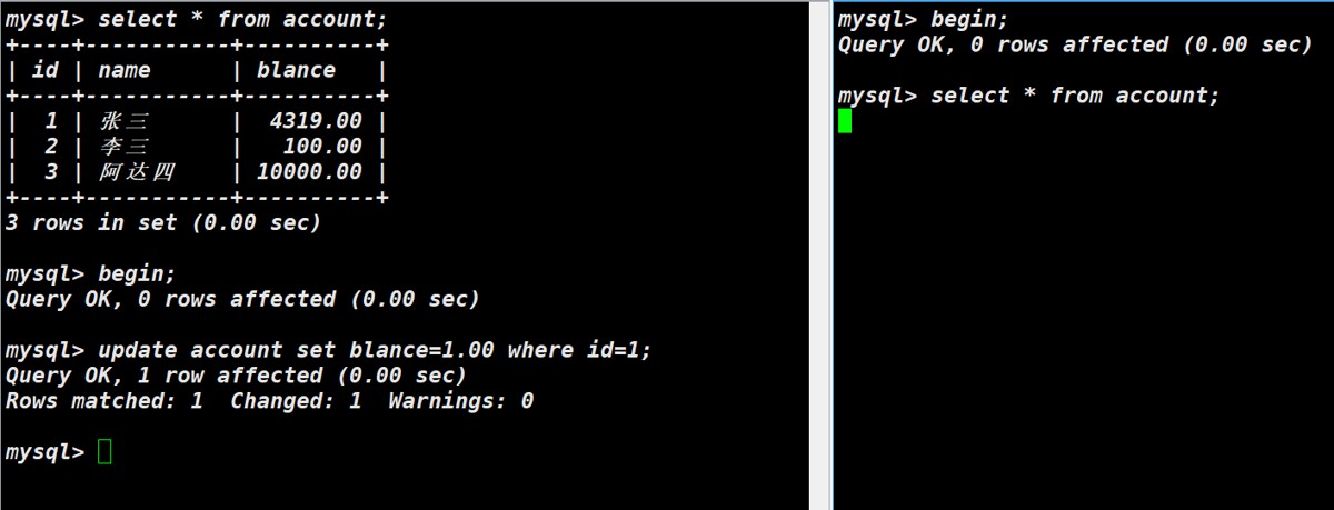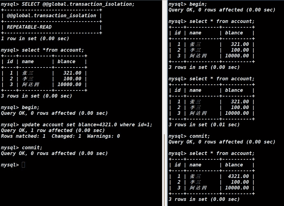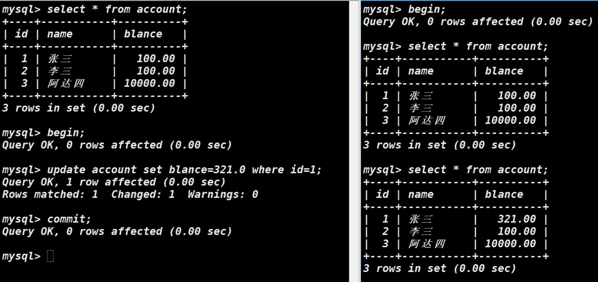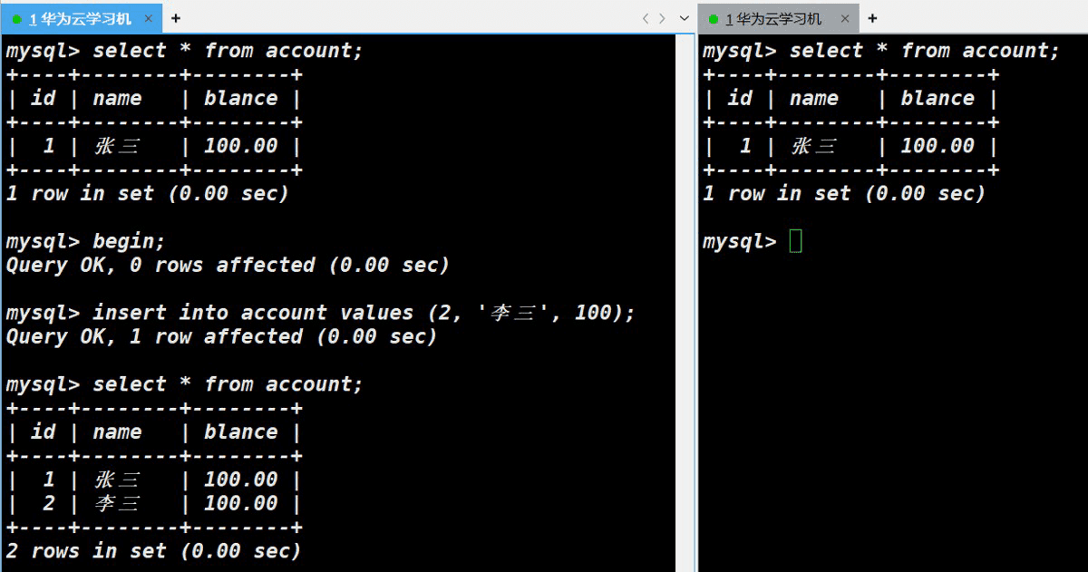 同时开启主机A和主机B的事务,主机A更改某列数据,此时主机B访问表发现表仍然为原先旧数据;主机A进行commit保存数据,主机B再次访问,发现仍然为原先数据;主机B进行commit保存数据,此时再进行访问表,表才进行了更新。
