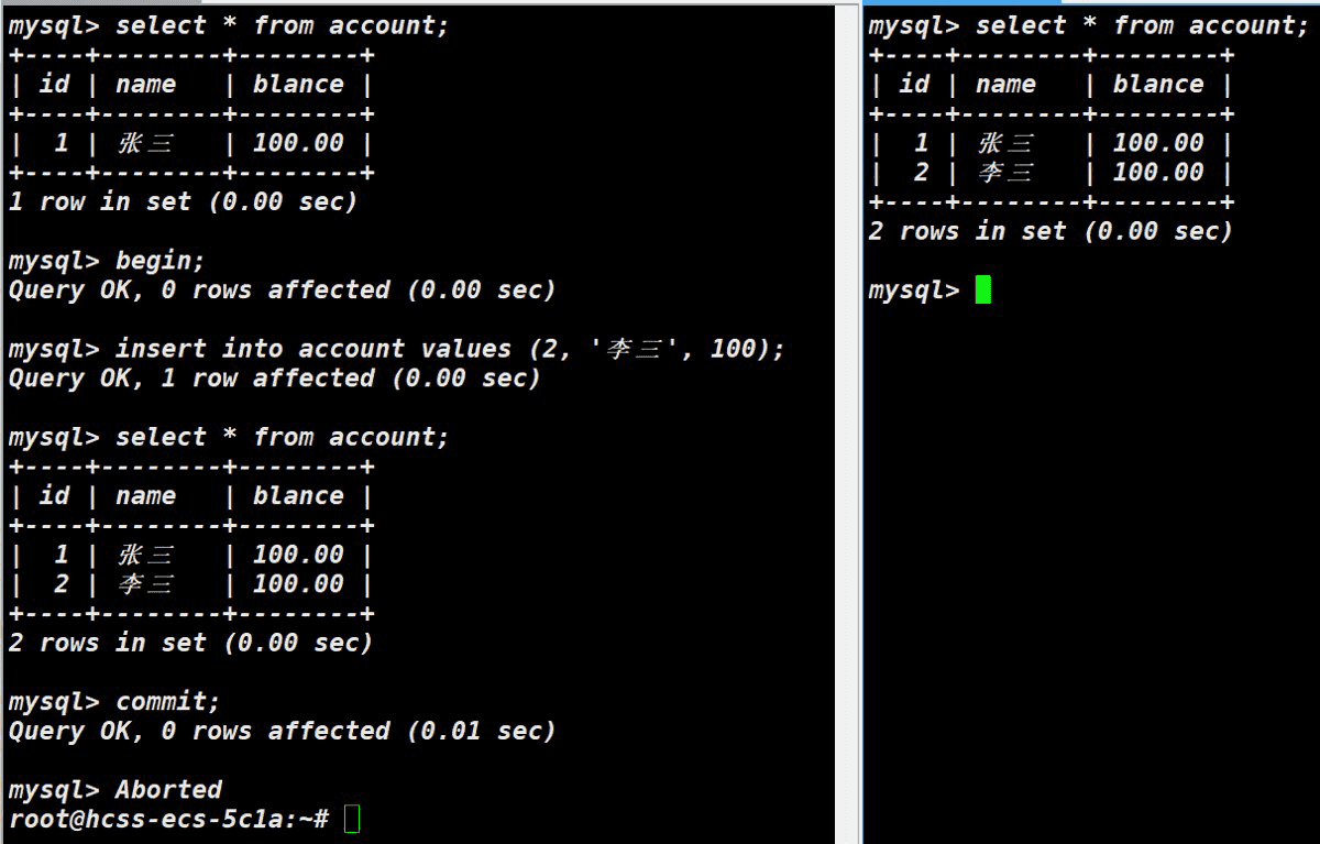 当我们对事务进行commit后,此时中断主机A,在主机B上查询表可以发现依然能看到commit前插入的数据。说明commit将数据永久保存在数据库中