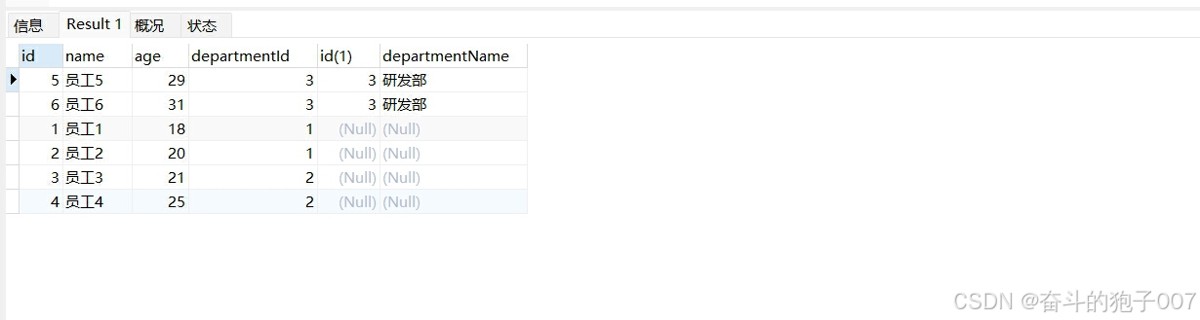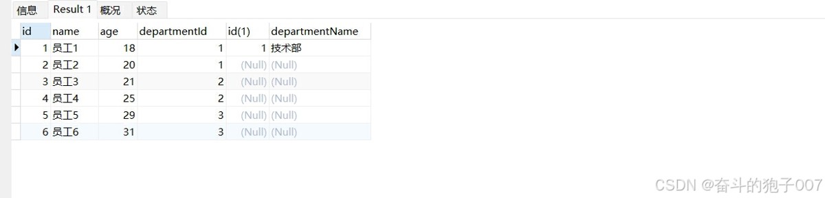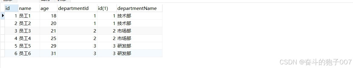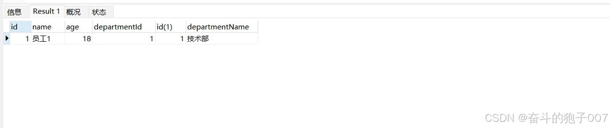 SELECT t1.*,t2.* FROM t_test_staff t1 left join t_test_department t2 on t1.departmentId = t2.id where t1.name = '员工1';