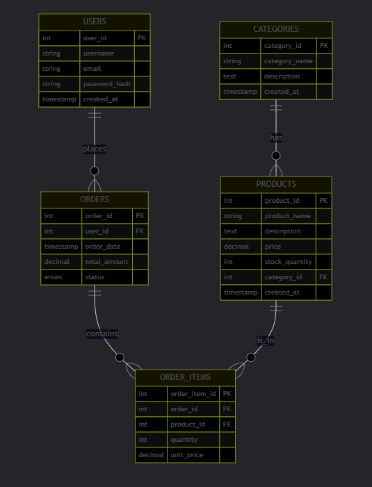 curl -X POST http://localhost:8080/api/categories \ -H "Content-Type: application/json" \ -d '{"categoryName":"Electronics","description":"Electronic devices and gadgets"}' - 创建商品: