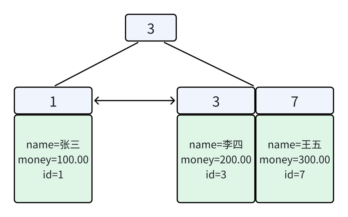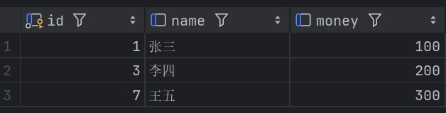 CREATE TABLE account_example ( id INT PRIMARY KEY AUTO_INCREMENT COMMENT '账户ID', name VARCHAR(20) COMMENT '姓名', money DOUBLE(10,2) COMMENT '余额', INDEX idx_name (name), INDEX idx_name_money (name, money) ) ENGINE=InnoDB; -- 插入数据 insert into account_example(id, name , money) values (1, '张三', 100.00), (3, '李四', 200.00), (7, '王五', 300.00);