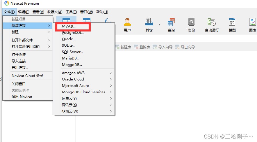 打开Navicat后点击左上角的文件,选择要连接的数据库mysql