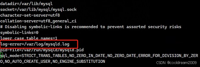 MySQL 的配置文件通常位于 /etc/my.cnf 中。我们需要打开该文件,并查找 log-error 这一项,它会指定 MySQL 错误日志的存储路径。下面是示例配置: