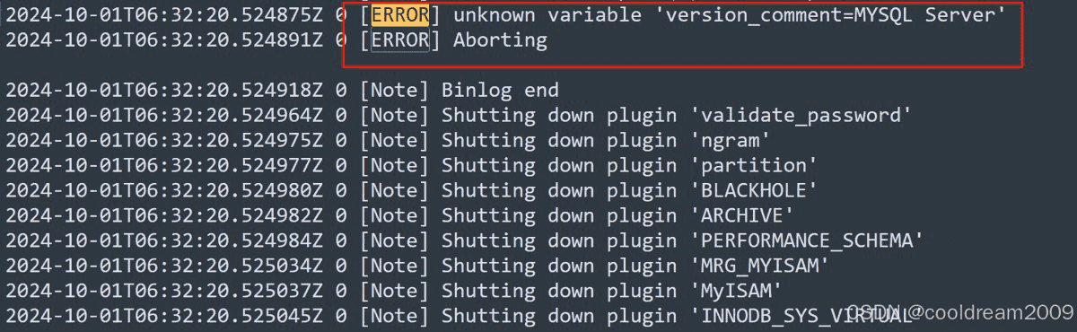 根据该错误提示,MySQL 报告了一个未知的变量 version_comment=MYSQL Server。这意味着 MySQL 的配置文件中存在一个无法识别的配置项,导致服务无法正常启动。