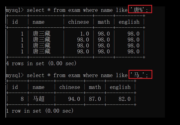 这里有两个选项%/_ ,%是指匹配大于等于0个字符的数据,_是只匹配只有一个字符的数据