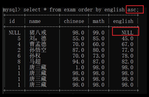 eg: select * from exam where name = ‘马超’ order by english asc limit 0,3;