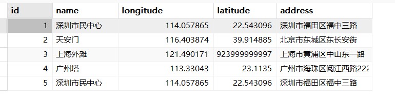 INSERT INTO poi (name, location, address) VALUES ( '深圳市民中心', ST_SRID(Point(114.057865, 22.543096), 4326), -- Point(经度, 纬度) '深圳市福田区福中三路' );