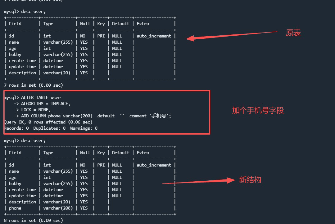 /usr/bin/pt-online-schema-change \ --socket=/tmp/mysql.sock \ --user=root \ --password='dinglian123@' \ --alter="ADD COLUMN description varchar(20) DEFAULT '' COMMENT '这是字段描述'" \ D=web_app,t=user \ --print \ --execute