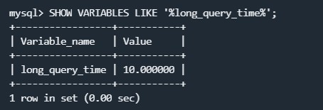 执行命令SHOW VARIABLES LIKE '%long_query_time%';输出慢查询的拦截时间,默认时间是10s: