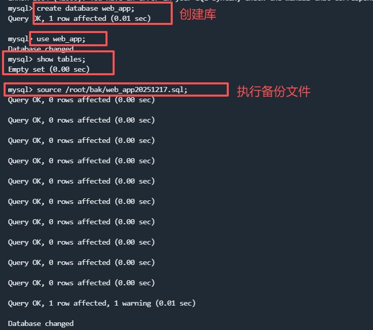 备份该数据库,执行命令:mysqldump --user=root -p --databases web_app > web_app20251217.sql