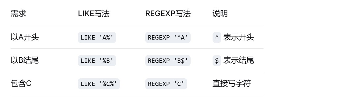 ✅ REGEXP比LIKE更强大,适合复杂模式匹配