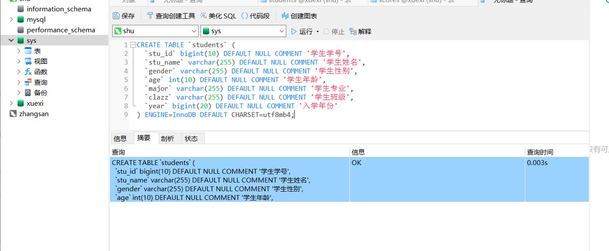 CREATE TABLE `students` ( `stu_id` bigint(10) DEFAULT NULL COMMENT '学生学号', `stu_name` varchar(255) DEFAULT NULL COMMENT '学生姓名', `gender` varchar(255) DEFAULT NULL COMMENT '学生性别', `age` int(10) DEFAULT NULL COMMENT '学生年龄', `major` varchar(255) DEFAULT NULL COMMENT '学生专业', `clazz` varchar(255) DEFAULT NULL COMMENT '学生班级', `year` bigint(20) DEFAULT NULL COMMENT '入学年份' ) ENGINE=InnoDB DEFAULT CHARSET=utf8mb4;