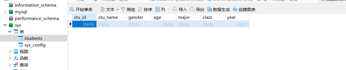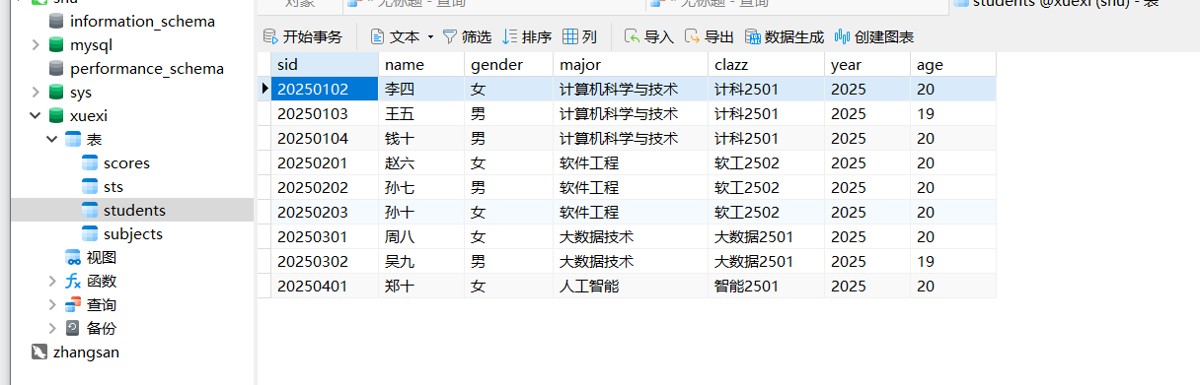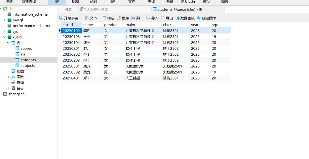 先定义核心业务表(后文会详细讲解表创建):students(学生表)、scores(成绩表)、subjects(科目表),从单表查询入手逐步进阶。