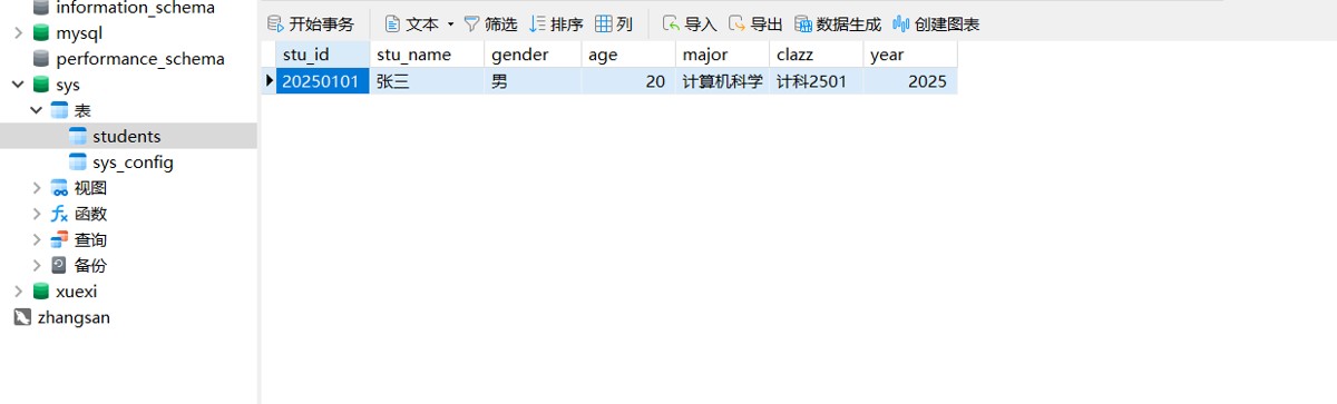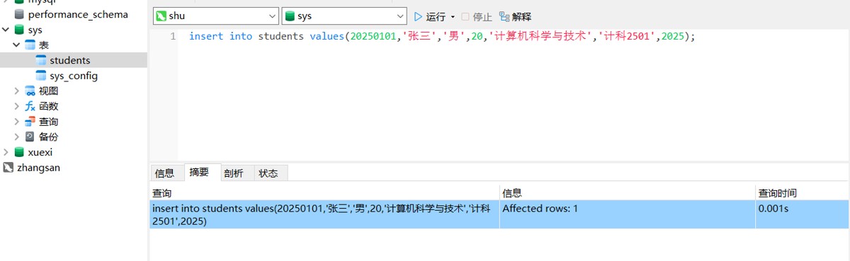 insert into students values(20250101,'张三','男',20,'计算机科学与技术','计科2501',2025);