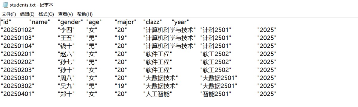 insert into students(stu_id,stu_name,gender,age,major,clazz,year) values (20250101,'张三','男',20,'计算机科学与技术','计科2501',2025), (20250102,'李四','女',20,'计算机科学与技术','计科2501',2025), (20250103,'王五','男',19,'计算机科学与技术','计科2501',2025);