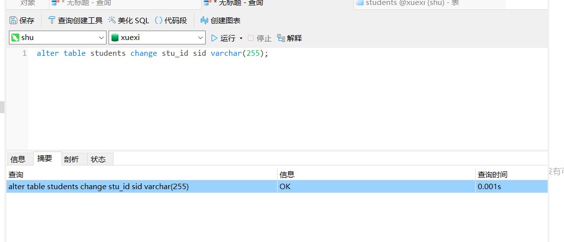 | 重命名字段 | alter table students change stu_id sid varchar(255); | 重名字段并改类型 |