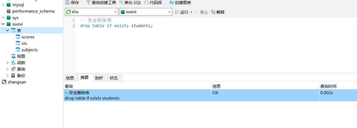 -- 安全删除表 drop table if exists students;