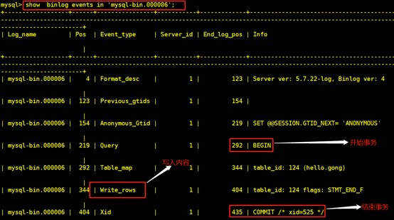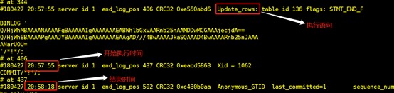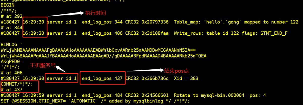 查看日志发现,在备份数据后首先执行的是插入数据操作(在一个事务内),此时可以通过指定pos结束点恢复(部分恢复),如图,pos结束点位435(事务已提交表示结束),执行命令如下,