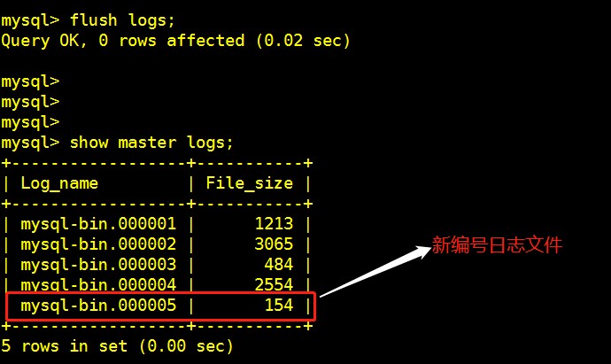 Flush logs 刷新日志,此刻开始产生一个新编号的binlog文件,例如: