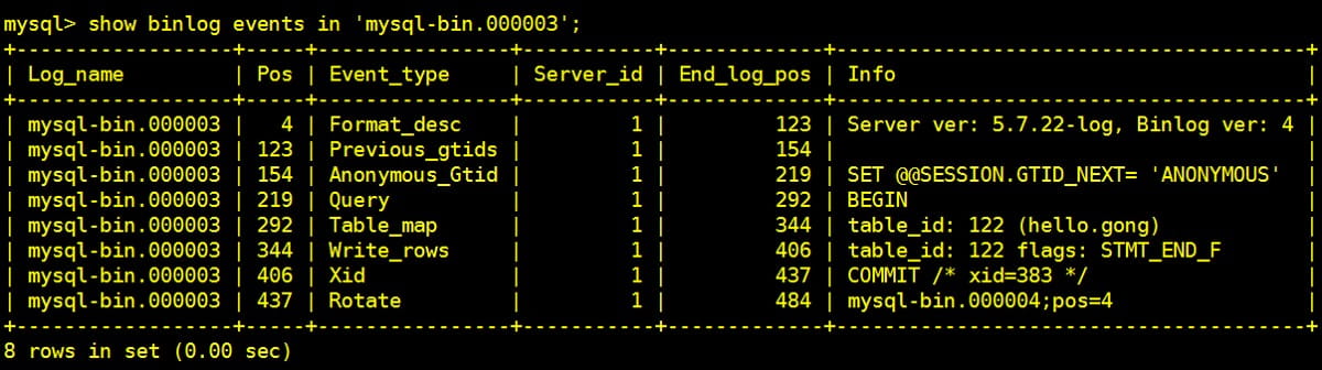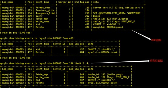 上面的方法读取内容较多不易观察,以下命令更为方便查看命令:show binlog events in ‘mysql-bin.000003’;
