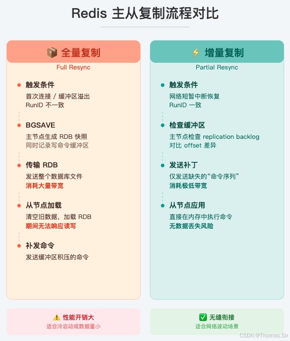 - 增量同步 :初始化后,主节点每次执行的写命令都会同步发送给从节点,实现增量同步。