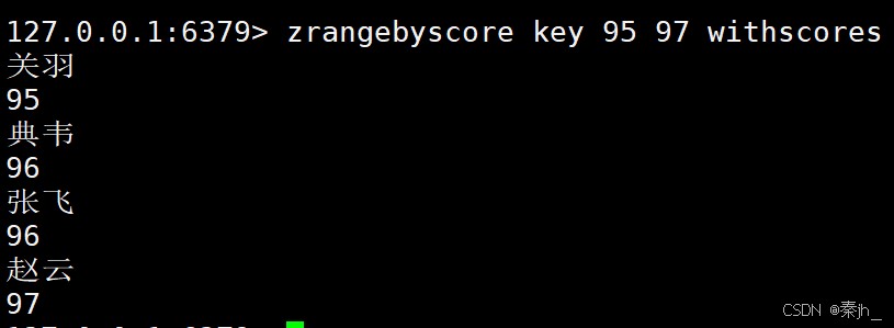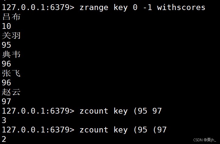 返回分数在 min 和 max 之间的元素,默认情况下,min 和 max 都是包含的,可以通过 ( 排除。