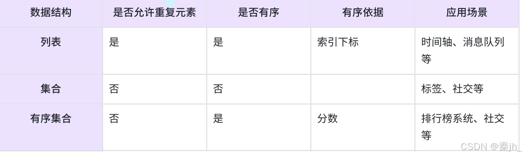 列表、集合、有序集合三者的异同点:
