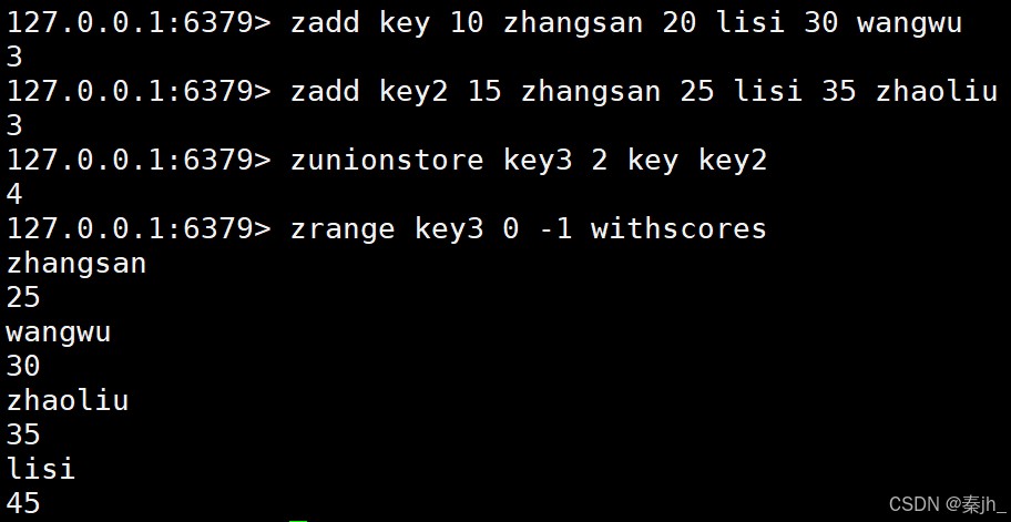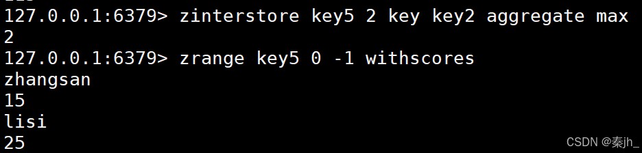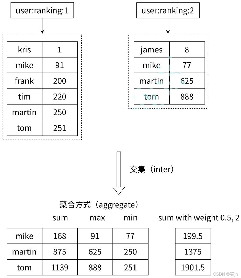 求出给定有序集合中元素的交集并保存进目标有序集合中,在合并过程中以元素为单位进行合并,元 素对应的分数按照不同的聚合方式和权重得到新的分数。