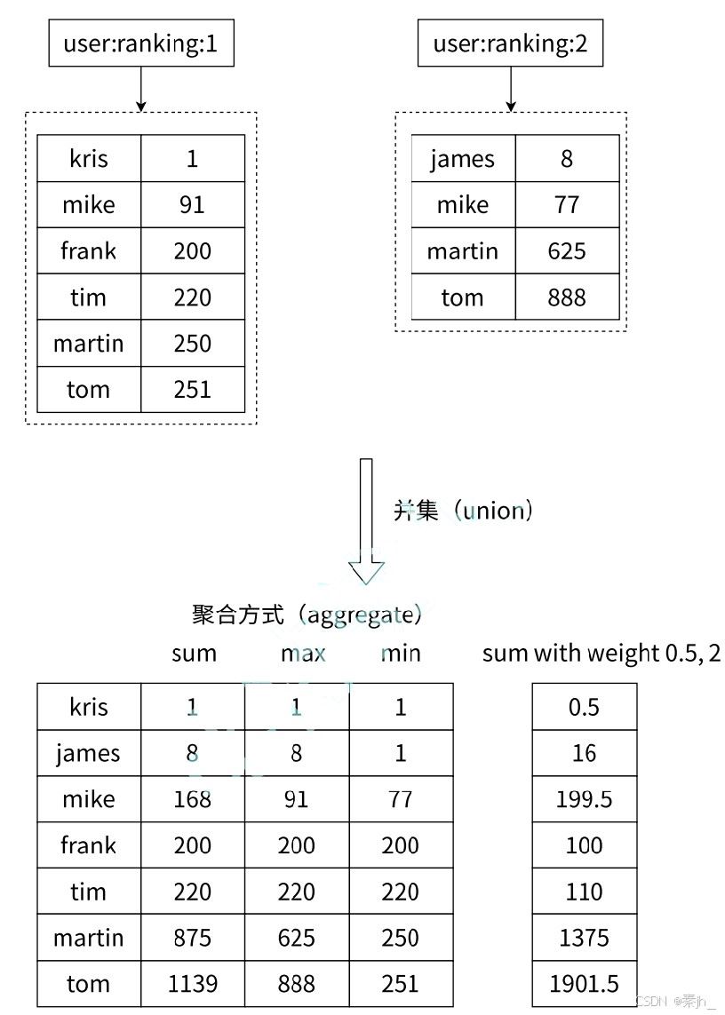 求出给定有序集合中元素的并集并保存进目标有序集合中,在合并过程中以元素为单位进行合并,元 素对应的分数按照不同的聚合方式和权重得到新的分数。