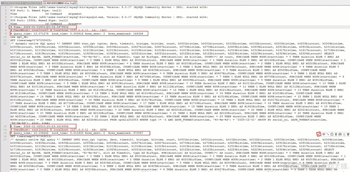 C:\Program Files (x86)\xnms-install\mysql\bin\mysqld.exe, Version: 8.0.17 (MySQL Community Server - GPL). started with: TCP Port: 0, Named Pipe: (null) Time Id Command Argument C:\Program Files (x86)\xnms-install\mysql\bin\mysqld.exe, Version: 8.0.17 (MySQL Community Server - GPL). started with: TCP Port: 13306, Named Pipe: (null) Time Id Command Argument # Time: 2026-01-01T01:20:18.547950Z # User@Host: root[root] @ localhost [127.0.0.1] Id: 1907 # Query_time: 13.071278 Lock_time: 0.000818 Rows_sent: 0 Rows_examined: 166336 use xpt_db; SET timestamp=1767230405; /* dynamic native SQL query */ INSERT INTO stac_rpt (rptsn, date, timesolt, biztype, biztime, count, h0001biztime, h0001bizcount, h0102biztime, h0102bizcount, h0203biztime, h0203bizcount, h0304biztime, h0304bizcount, h0405biztime, h0405bizcount, h0506biztime, h0506bizcount, h0607biztime, h0607bizcount, h0708biztime, h0708bizcount, h0809biztime, h0809bizcount, h0910biztime, h0910bizcount, h1011biztime, h1011bizcount, h1112biztime, h1112bizcount, h1213biztime, h1213bizcount, h1314biztime, h1314bizcount, h1415biztime, h1415bizcount, h1516biztime, h1516bizcount, h1617biztime, h1617bizcount, h1718biztime, h1718bizcount, h1819biztime, h1819bizcount, h1920biztime, h1920bizcount, h2021biztime, h2021bizcount, h2122biztime, h2122bizcount, h2223biztime, h2223bizcount, h2324biztime, h2324bizcount) SELECT serial_no AS RptSN, DATE_FORMAT(starttime, '%Y-%m-%d'), slot AS TimeSolt, type AS BizType, SUM(duration) AS biztime, COUNT(*) AS count, SUM(CASE WHEN HOUR(starttime) = 0 THEN duration ELSE 0 END) AS H0001BizTime, COUNT(CASE WHEN HOUR(starttime) = 0 THEN 1 ELSE NULL END) AS H0001BizCount, SUM(CASE WHEN HOUR(starttime) = 1 THEN duration ELSE 0 END) AS H0102BizTime, COUNT(CASE WHEN HOUR(starttime) = 1 THEN 1 ELSE NULL END) AS H0102BizCount, SUM(CASE WHEN HOUR(starttime) = 2 THEN duration ELSE 0 END) AS H0203BizTime, COUNT(CASE WHEN HOUR(starttime) = 2 THEN 1 ELSE NULL END) AS H0203BizCount, SUM(CASE WHEN HOUR(starttime) = 3 THEN duration ELSE 0 END) AS H0304BizTime, COUNT(CASE WHEN HOUR(starttime) = 3 THEN 1 ELSE NULL END) AS H0304BizCount, SUM(CASE WHEN HOUR(starttime) = 4 THEN duration ELSE 0 END) AS H0405BizTime, COUNT(CASE WHEN HOUR(starttime) = 4 THEN 1 ELSE NULL END) AS H0405BizCount, SUM(CASE WHEN HOUR(starttime) = 5 THEN duration ELSE 0 END) AS H0506BizTime, COUNT(CASE WHEN HOUR(starttime) = 5 THEN 1 ELSE NULL END) AS H0506BizCount, SUM(CASE WHEN HOUR(starttime) = 6 THEN duration ELSE 0 END) AS H0607BizTime, COUNT(CASE WHEN HOUR(starttime) = 6 THEN 1 ELSE NULL END) AS H0607BizCount, SUM(CASE WHEN HOUR(starttime) = 7 THEN duration ELSE 0 END) AS H0708BizTime, COUNT(CASE WHEN HOUR(starttime) = 7 THEN 1 ELSE NULL END) AS H0708BizCount, SUM(CASE WHEN HOUR(starttime) = 8 THEN duration ELSE 0 END) AS H0809BizTime, COUNT(CASE WHEN HOUR(starttime) = 8 THEN 1 ELSE NULL END) AS H0809BizCount, SUM(CASE WHEN HOUR(starttime) = 9 THEN duration ELSE 0 END) AS H0910BizTime, COUNT(CASE WHEN HOUR(starttime) = 9 THEN 1 ELSE NULL END) AS H0910BizCount, SUM(CASE WHEN HOUR(starttime) = 10 THEN duration ELSE 0 END) AS H1011BizTime, COUNT(CASE WHEN HOUR(starttime) = 10 THEN 1 ELSE NULL END) AS H1011BizCount, SUM(CASE WHEN HOUR(starttime) = 11 THEN duration ELSE 0 END) AS H1112BizTime, COUNT(CASE WHEN HOUR(starttime) = 11 THEN 1 ELSE NULL END) AS H1112BizCount, SUM(CASE WHEN HOUR(starttime) = 12 THEN duration ELSE 0 END) AS H1213BizTime, COUNT(CASE WHEN HOUR(starttime) = 12 THEN 1 ELSE NULL END) AS H1213BizCount, SUM(CASE WHEN HOUR(starttime) = 13 THEN duration ELSE 0 END) AS H1314BizTime, COUNT(CASE WHEN HOUR(starttime) = 13 THEN 1 ELSE NULL END) AS H1314BizCount, SUM(CASE WHEN HOUR(starttime) = 14 THEN duration ELSE 0 END) AS H1415BizTime, COUNT(CASE WHEN HOUR(starttime) = 14 THEN 1 ELSE NULL END) AS H1415BizCount, SUM(CASE WHEN HOUR(starttime) = 15 THEN duration ELSE 0 END) AS H1516BizTime, COUNT(CASE WHEN HOUR(starttime) = 15 THEN 1 ELSE NULL END) AS H1516BizCount, SUM(CASE WHEN HOUR(starttime) = 16 THEN duration ELSE 0 END) AS H1617BizTime, COUNT(CASE WHEN HOUR(starttime) = 16 THEN 1 ELSE NULL END) AS H1617BizCount, SUM(CASE WHEN HOUR(starttime) = 17 THEN duration ELSE 0 END) AS H1718BizTime, COUNT(CASE WHEN HOUR(starttime) = 17 THEN 1 ELSE NULL END) AS H1718BizCount, SUM(CASE WHEN HOUR(starttime) = 18 THEN duration ELSE 0 END) AS H1819BizTime, COUNT(CASE WHEN HOUR(starttime) = 18 THEN 1 ELSE NULL END) AS H1819BizCount, SUM(CASE WHEN HOUR(starttime) = 19 THEN duration ELSE 0 END) AS H1920BizTime, COUNT(CASE WHEN HOUR(starttime) = 19 THEN 1 ELSE NULL END) AS H1920BizCount, SUM(CASE WHEN HOUR(starttime) = 20 THEN duration ELSE 0 END) AS H2021BizTime, COUNT(CASE WHEN HOUR(starttime) = 20 THEN 1 ELSE NULL END) AS H2021BizCount, SUM(CASE WHEN HOUR(starttime) = 21 THEN duration ELSE 0 END) AS H2122BizTime, COUNT(CASE WHEN HOUR(starttime) = 21 THEN 1 ELSE NULL END) AS H2122BizCount, SUM(CASE WHEN HOUR(starttime) = 22 THEN duration ELSE 0 END) AS H2223BizTime, COUNT(CASE WHEN HOUR(starttime) = 22 THEN 1 ELSE NULL END) AS H2223BizCount, SUM(CASE WHEN HOUR(starttime) = 23 THEN duration ELSE 0 END) AS H2324BizTime, COUNT(CASE WHEN HOUR(starttime) = 23 THEN 1 ELSE NULL END) AS H2324BizCount FROM rptbiz202553 WHERE type != -1 AND DATE_FORMAT(starttime, '%Y-%m-%d') = '2025-12-31' GROUP BY serial_no, DATE_FORMAT(starttime, '%Y-%m-%d'), slot, type; # Time: 2026-01-02T10:20:23.331405Z # User@Host: root[root] @ localhost [127.0.0.1] Id: 3256 # Query_time: 10.106222 Lock_time: 0.011833 Rows_sent: 0 Rows_examined: 370067 SET timestamp=1767349213; /* dynamic native SQL query */ INSERT INTO stac_rpt (rptsn, date, timesolt, biztype, biztime, count, h0001biztime, h0001bizcount, h0102biztime, h0102bizcount, h0203biztime, h0203bizcount, h0304biztime, h0304bizcount, h0405biztime, h0405bizcount, h0506biztime, h0506bizcount, h0607biztime, h0607bizcount, h0708biztime, h0708bizcount, h0809biztime, h0809bizcount, h0910biztime, h0910bizcount, h1011biztime, h1011bizcount, h1112biztime, h111
