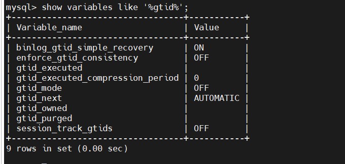 mysql> show variables like '%gtid%'; +----------------------------------+-----------+ | Variable_name | Value | +----------------------------------+-----------+ | binlog_gtid_simple_recovery | ON | | enforce_gtid_consistency | ON | | gtid_executed | | | gtid_executed_compression_period | 0 | | gtid_mode | ON | | gtid_next | AUTOMATIC | | gtid_owned | | | gtid_purged | | | session_track_gtids | OFF | +----------------------------------+-----------+ 9 rows in set (0.01 sec)