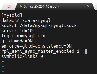 [root@mysql-node1 ~]# vim /etc/my.cnf [mysqld] datadir=/data/mysql socket=/data/mysql/mysql.sock server-id=1 log-bin=mysql-bin gtid_mode=ON enforce-gtid-consistency=ON rpl_semi_sync_master_enabled=1 #开启半同步功能 symbolic-links=0