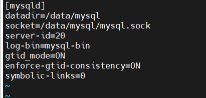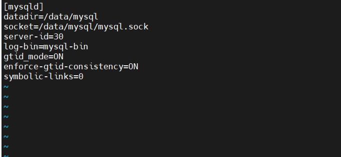 [root@mysql-node1 ~]# vim /etc/my.cnf [mysqld] datadir=/data/mysql socket=/data/mysql/mysql.sock server-id=1 log-bin=mysql-bin gtid_mode=ON enforce-gtid-consistency=ON symbolic-links=0 [root@mysql-node1 ~]# /etc/init.d/mysqld restart
