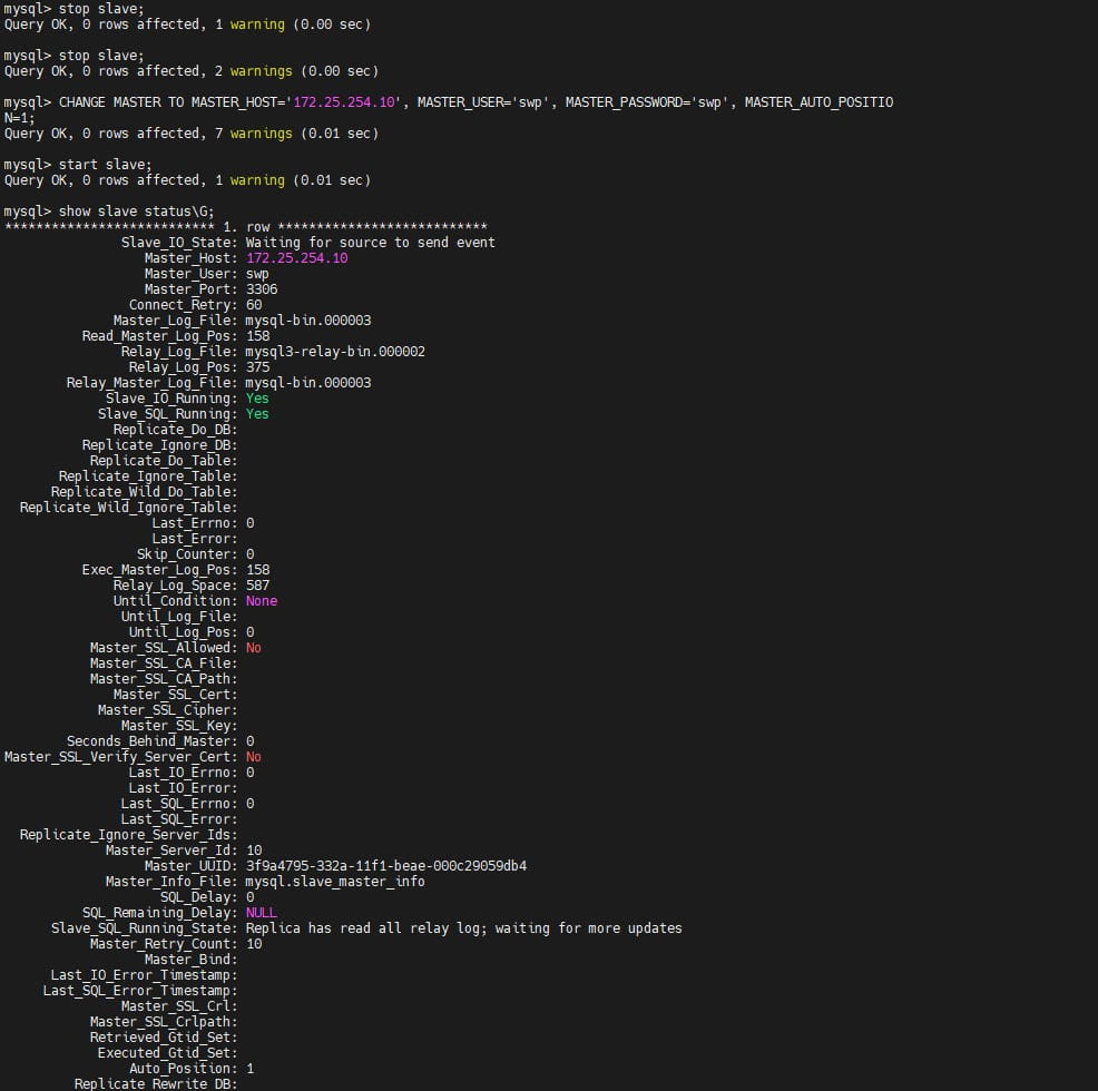 mysql> CHANGE MASTER TO MASTER_HOST='172.25.254.10', MASTER_USER='swp', MASTER_PASSWORD='swp', MASTER_AUTO_POSITIO N=1;