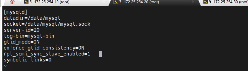 [root@mysql-slave和slave2都做 ~]# vim /etc/my.cnf [mysqld] datadir=/data/mysql socket=/data/mysql/mysql.sock server-id=1 log-bin=mysql-bin gtid_mode=ON enforce-gtid-consistency=ON rpl_semi_sync_slave_enabled=1 #开启半同步功能 symbolic-links=0