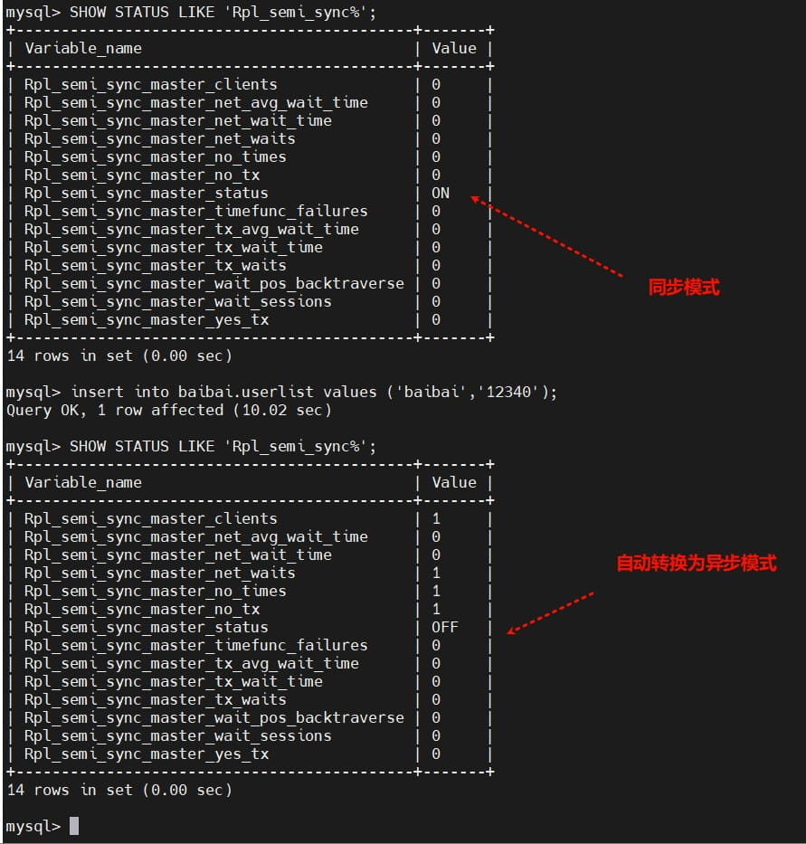| Rpl_semi_sync_master_status | OFF | #自动转为异步模式,当slave恢复